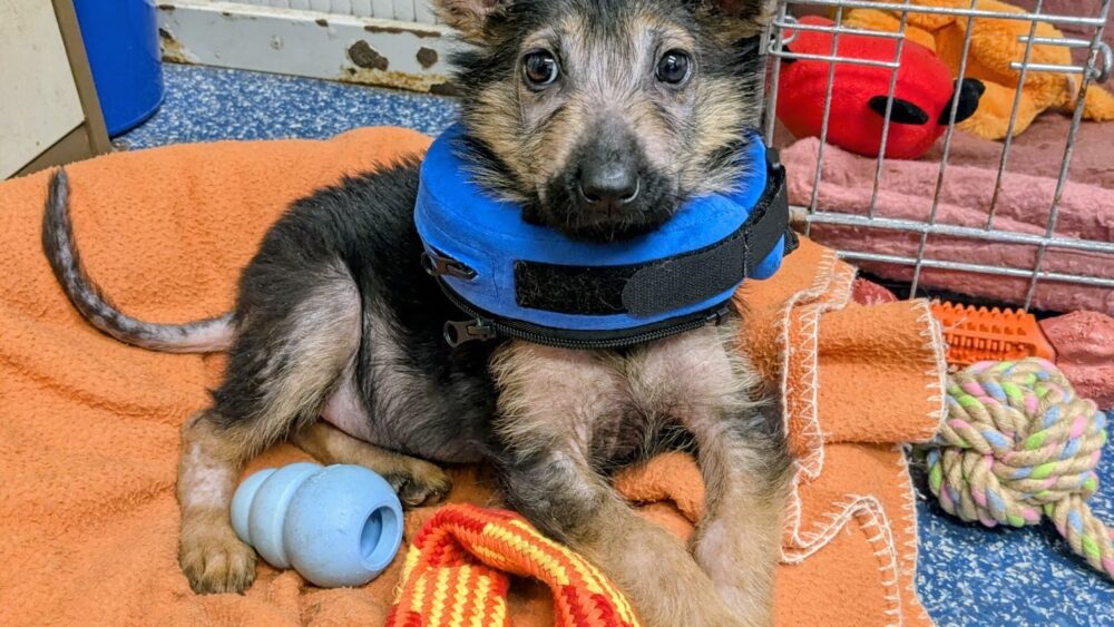 Say hello to our pretty pup Toffee! This little lady was signed over to us shortly after being bought from a breeder and found in a terrible state. Poor toffee is suffering with a yeast infection, was underweight and covered in scabs at only 10 weeks old. Toffee was sold as a German Shepherd puppy however she is extremely small and we believe she may be mixed with something else. Toffee is struggling with her sore skin and alopecia and is sadly yet another case of backyard breeding. She is currently having medicated baths and her new owners will need to keep up with this.