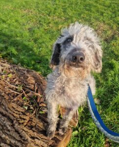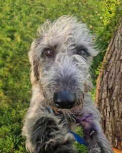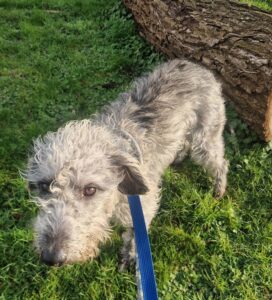 Ebenezer Scrooge is a young Bedlington Whippet mix who arrived in our care as a stray. This full-on handsome scruffbag has clearly had a bit of a rough start, but beneath the curls is the sweetest, most endearing lad.