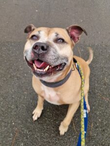 Milo is a mature gentleman who arrived in our care due to no fault of his own. He is approximately 9-10 years old with the energy of a puppy. He is a staffie mix.
