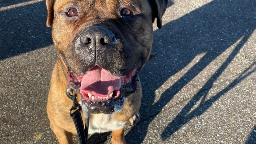 Ronnie is the happiest lad, from the moment he leaves his kennel his happy tail is non stop and his big slobbery chops are filled with a massive grin! He adores going out on walks with his pals and will pick up a toy on the way out of kennels to carry with him on his travels . Ronnie is a big lad that doesn’t know his size and will jump all over you for cuddles and (very) slobbery kisses , his new owners will need to be large breed experienced.