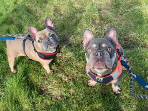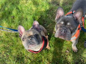 Fish (frenchie lliw glas) yw’r frenchie mwyaf hyderus ac mae Chips (frenchie lliw haul) yn ffeindio cysur yn ei phresenoldeb.